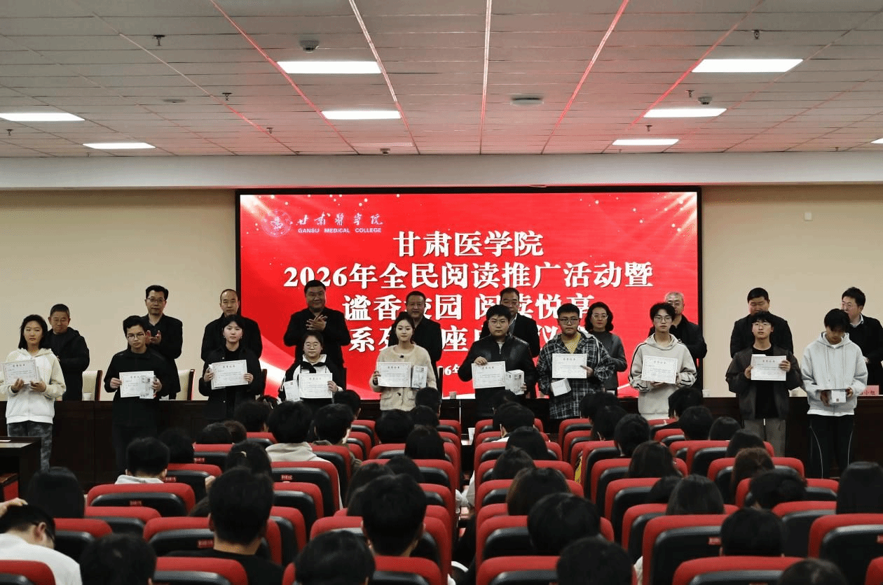 启动仪式上,党委宣传统战部部长韩小林、党委学生工作部(处)部长陈怡名、图书馆副馆长穆亚梅、科技处负责人吕小旭分别宣读《关于表彰2025年‘AI+信息素养’大赛省赛获奖学生的决定》《关于表彰2025年阅读推广活动先进集体、个人的决定》《甘肃医学院2026年全民阅读推广活动方案》《甘肃医学院关于开展“谧香校园 阅读悦享”阅读推广系列讲座的通知》,并对在2025年阅读推广活动及大学生“AI+信息素养”大赛中表现突出的先进集体、班级、个人颁发证书。
