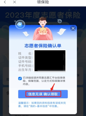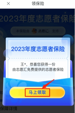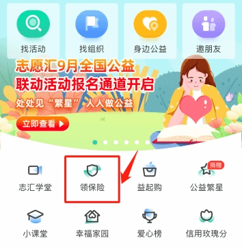 二、领保险(进入APP首页,每人都可以免费领取一份志愿者保险哦~)