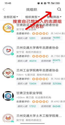 1.点击首页左上角,调整定位至当前所在城市,点击“找组织”, 搜索查找自己想加入的志愿组织名称