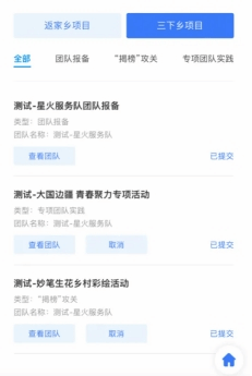 登录首页,点击【我参与的】,可以查看已参与的社会实践项目及团队信息。如需修改团队信息、更换团队成员等,可点击【取消】,取消报名后,重新填写团队信息再次报名。在【团队报备】界面填写的团队无法自行取消,可联系团队负责人(学生队长)所在学校管理员予以解散;已被录取的专项活动团队、“揭榜”攻关团队无法自行解散。