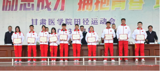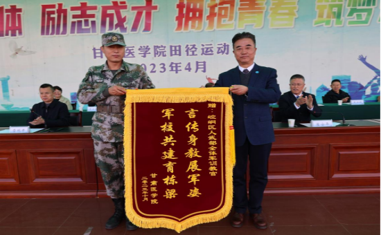汪永锋为承训部队赠送了锦旗,杨建福宣读了《甘肃医学院关于表彰2023年军事训练先进集体和先进个人的决定》和《甘肃医学院关于表彰第五届大学生运动会先进集体和先进个人的决定》,与会学校领导为获奖代表颁发了奖牌和证书。