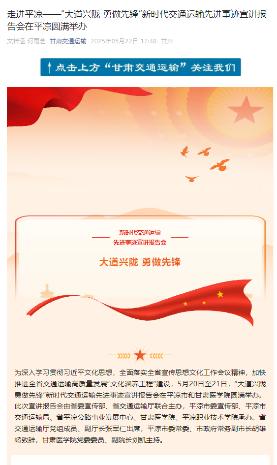 为深入学习贯彻习近平文化思想,全面落实全省宣传思想文化工作会议精神,加快推进全省交通运输高质量发展“文化涵养工程”建设,5月20日至21日,“大道兴陇 勇做先锋”新时代交通运输先进事迹宣讲报告会在平凉市和甘肃医学院圆满举办。此次宣讲报告会由省委宣传部、省交通运输厅联合主办,平凉市委宣传部、平凉市交通运输局、省平凉公路事业发展中心、甘肃医学院、平凉职业技术学院承办。省交通运输厅党组成员、副厅长张军仁出...