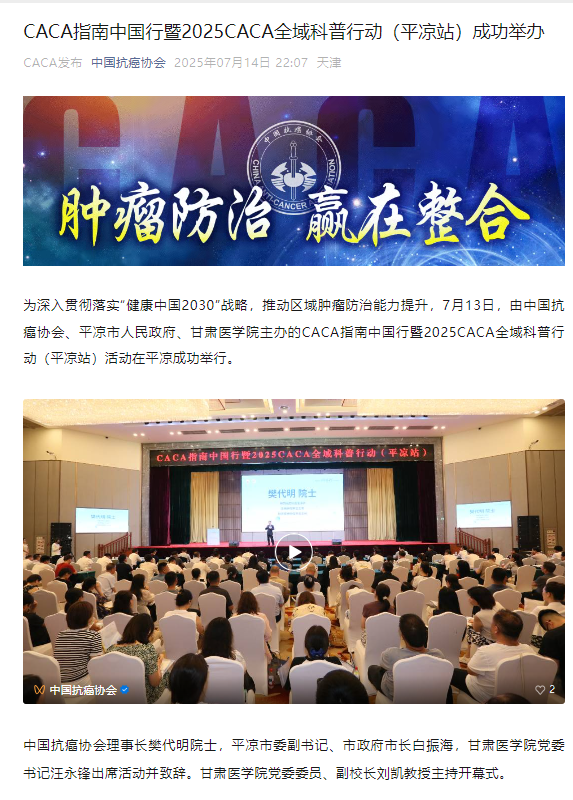 新甘肃客户端平凉讯(新甘肃·甘肃日报记者 田丽媛)7月13日,由中国抗癌协会、平凉市政府、甘肃医学院主办的《中国肿瘤整合诊治指南》中国行暨2025CACA全域科普行动(平凉站)活动在平凉举行,本次会议旨在践行医者使命,便利当地群众。开幕式上,举行了中国抗癌协会与甘肃医学院附属医院学科共建赋能专项启动仪式和国家消化系统临床医学研究中心网络单位合作签约仪式,向国家消化系统临床医学研究中心网络单位甘肃医学院附属医...