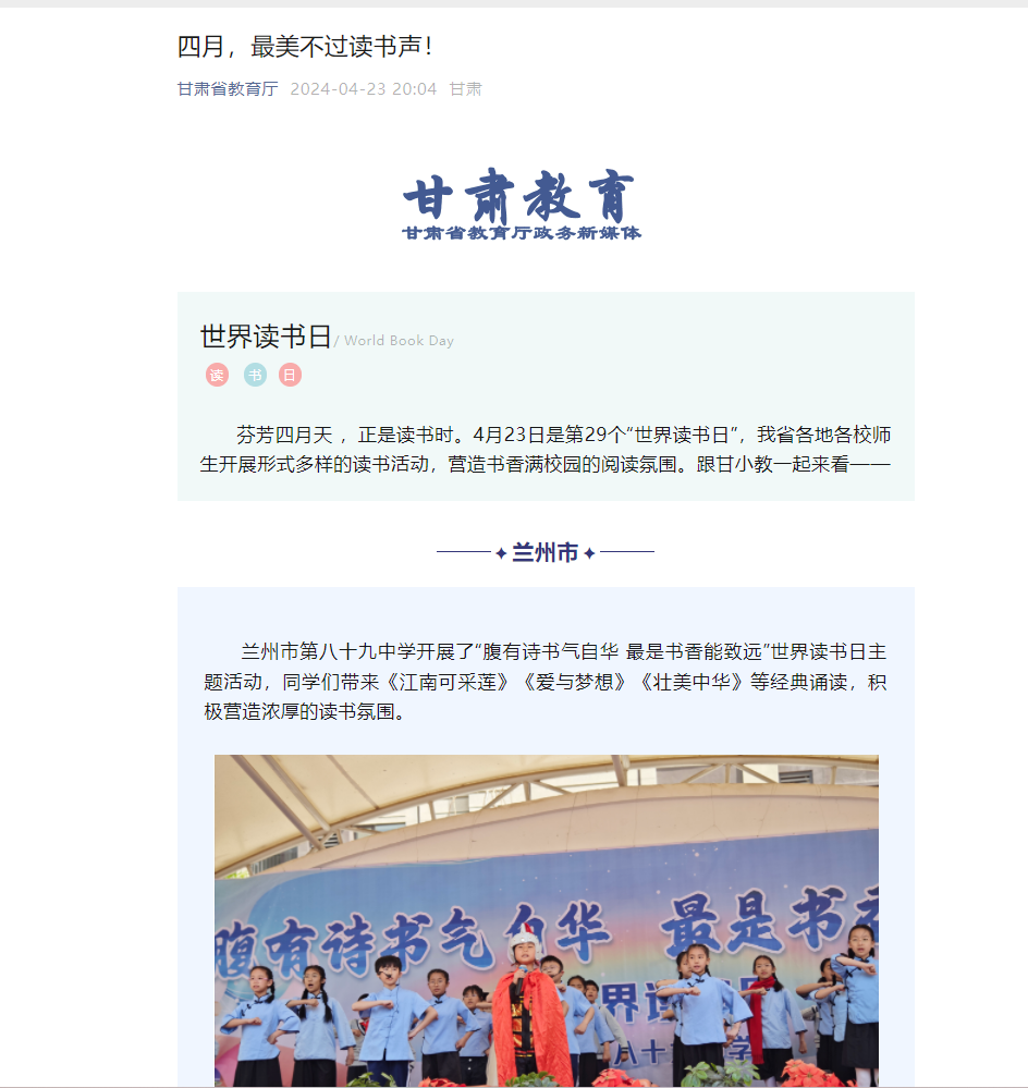 世界读书日/ World Book Day芬芳四月天 ,正是读书时。4月23日是第29个“世界读书日”,我省各地各校师生开展形式多样的读书活动,营造书香满校园的阅读氛围。跟甘小教一起来看——✦兰州市✦兰州市第八十九中学开展了“腹有诗书气自华 最是书香能致远”世界读书日主题活动,同学们带来《江南可采莲》《爱与梦想》《壮美中华》等经典诵读,积极营造浓厚的读书氛围。兰州市实验幼儿园举行了“绘本润童心 好书伴成长”主题活动,...
