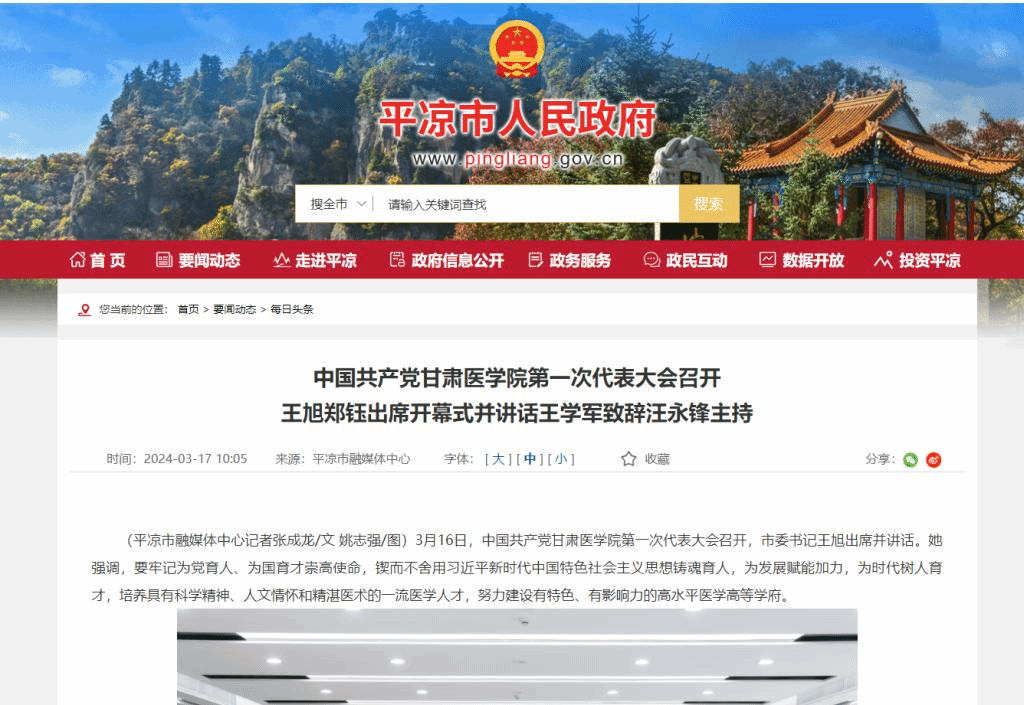 中国共产党甘肃医学院第一次代表大会召开王旭郑钰出席开幕式并讲话王学军致辞汪永锋主持(平凉市融媒体中心记者张成龙/文 姚志强/图)3月16日,中国共产党甘肃医学院第一次代表大会召开,市委书记王旭出席并讲话。她强调,要牢记为党育人、为国育才崇高使命,锲而不舍用习近平新时代中国特色社会主义思想铸魂育人,为发展赋能加力,为时代树人育才,培养具有科学精神、人文情怀和精湛医术的一流医学人才,努力建设有特色、有影...