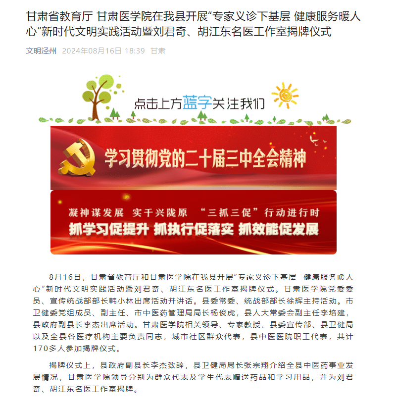 甘肃省教育厅 甘肃医学院在我县开展“专家义诊下基层 健康服务暖人心”新时代文明实践活动暨刘君奇、胡江东名医工作室揭牌仪式文明泾州2024年08月16日 18:39甘肃8月16日,甘肃省教育厅和甘肃医学院在我县开展“专家义诊下基层 健康服务暖人心”新时代文明实践活动暨刘君奇、胡江东名医工作室揭牌仪式。甘肃医学院党委委员、宣传统战部部长韩小林出席活动并讲话。县委常委、统战部部长徐辉主持活动。市卫健委党组成员、副主任、...