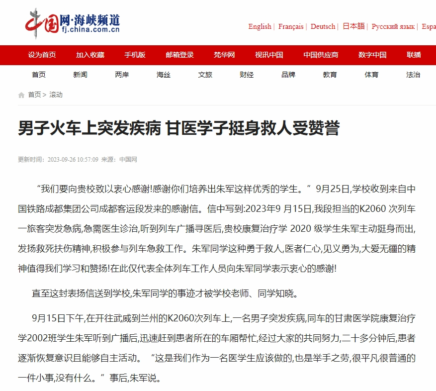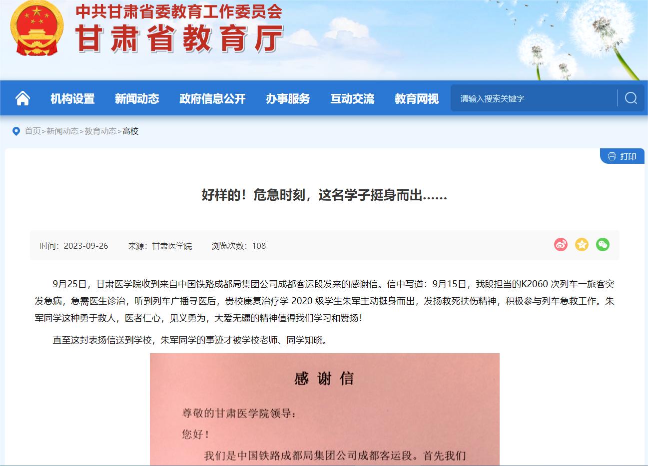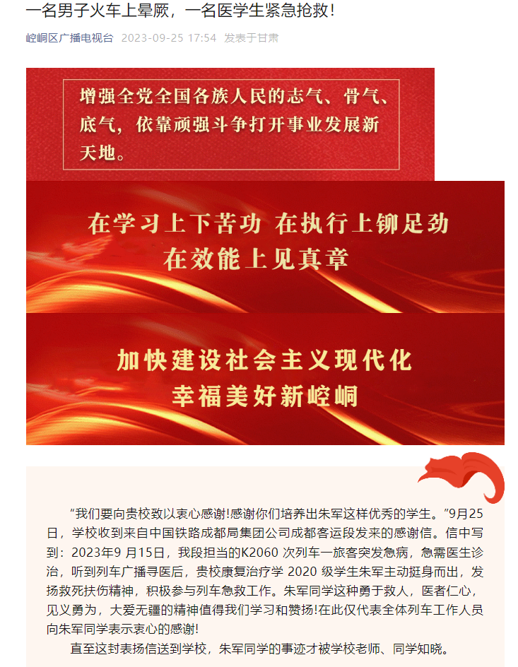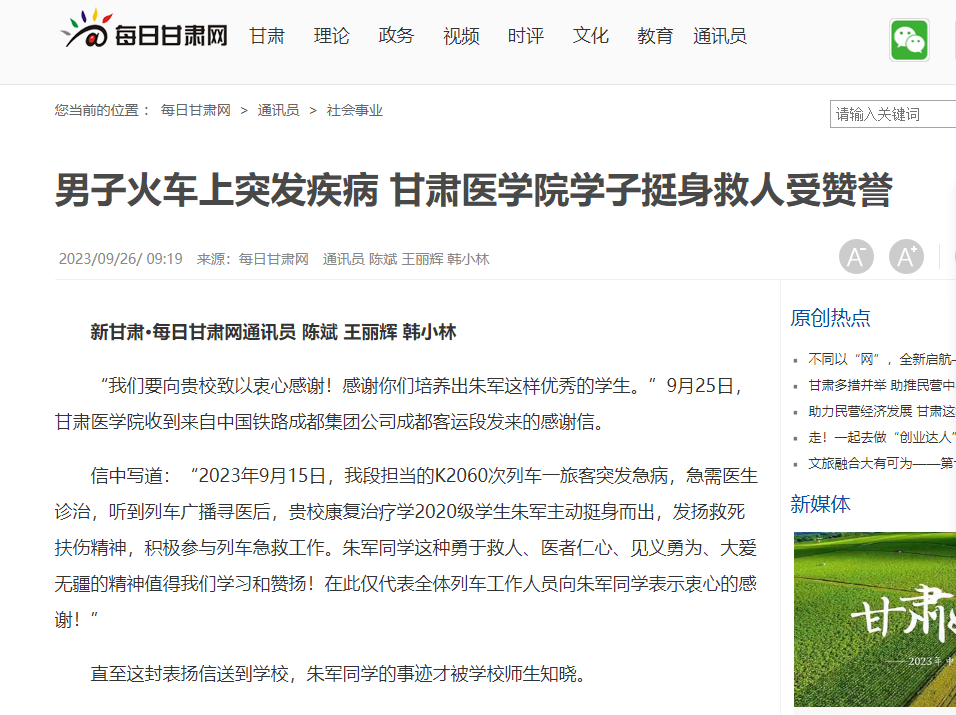 新甘肃·每日甘肃网通讯员 陈斌 王丽辉 韩小林 “我们要向贵校致以衷心感谢!感谢你们培养出朱军这样优秀的学生。”9月25日,甘肃医学院收到来自中国铁路成都集团公司成都客运段发来的感谢信。 信中写道:“2023年9月15日,我段担当的K2060次列车一旅客突发急病,急需医生诊治,听到列车广播寻医后,贵校康复治疗学2020级学生朱军主动挺身而出,发扬救死扶伤精神,积极参与列车急救工作。朱军同学这种勇于救人、医者仁心...