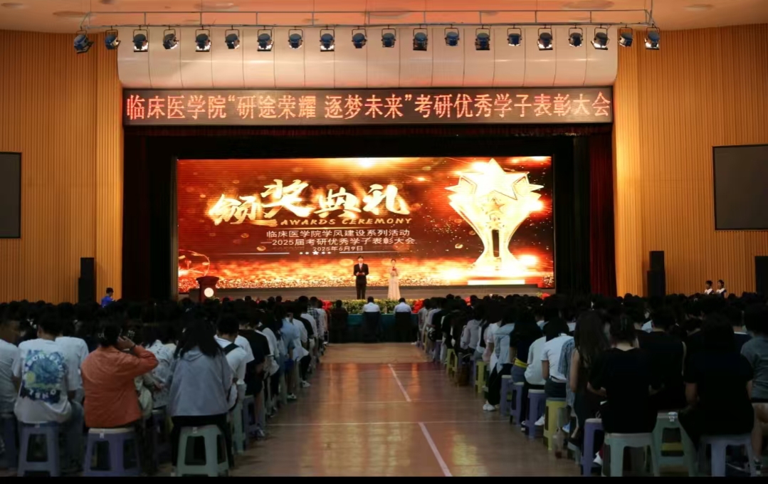 临床医学院举办2025届“研途荣耀·逐梦未来”考研优秀学子表彰大会2025年6月9日晚,临床医学院在学校体育馆举行2025届“研途荣耀·逐梦未来”考研优秀学子表彰大会,总结2025届毕业生考研成绩,分享交流经验,进一步营造积极向上、奋勇争先的学习氛围。党委委员、副校长刘凯,党委委员、副校长张艳出席会议并颁奖,相关部门、院系负责人和毕业班班主任、辅导员、学生代表1100多人参加。临床医学院2025届400名毕业生报考研究生考试...