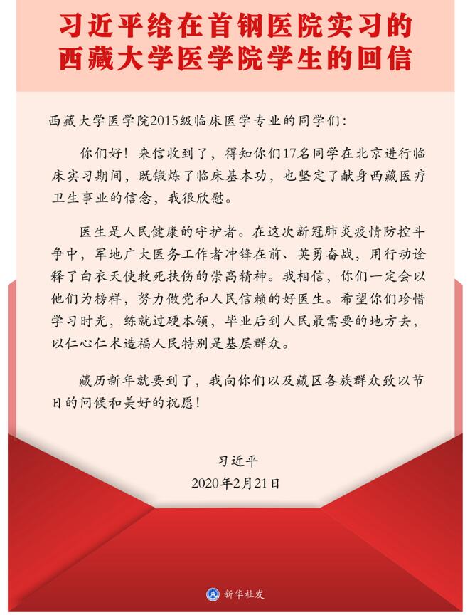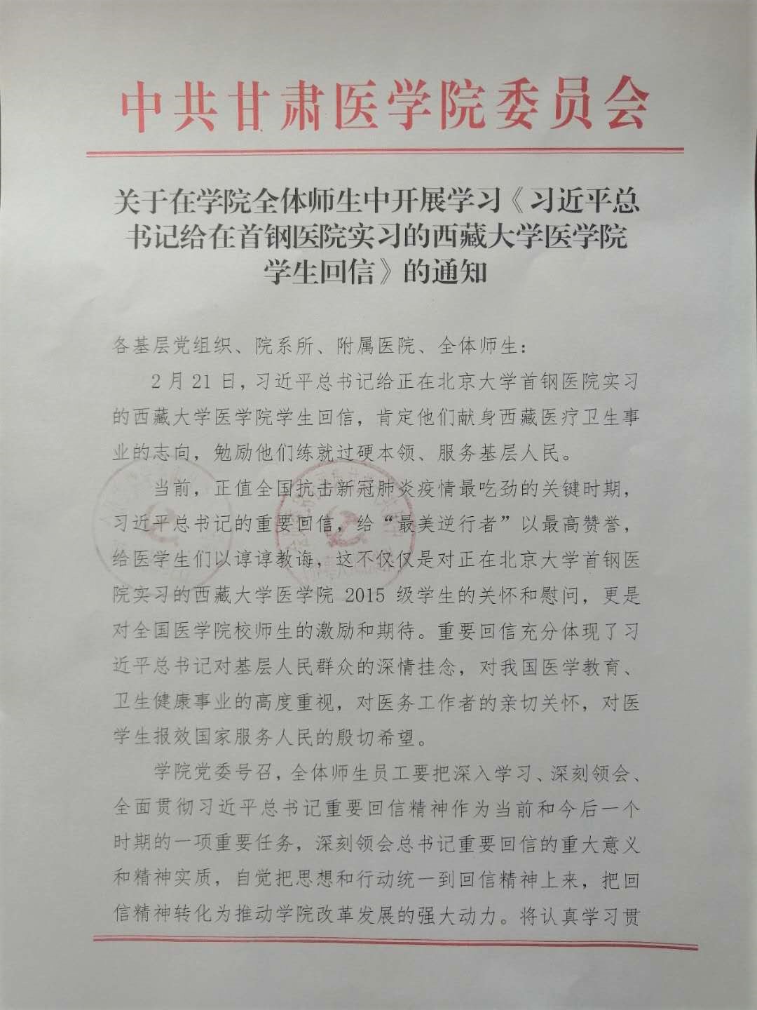 中共教育部党组关于学习贯彻习近平总书记给在首钢医院实习的西藏大学医学院学生重要回信精神的通知 教党〔2020〕15号 各省、自治区、直辖市党委教育工作部门、教育厅(教委),新疆生产建设兵团教育局,有关部门(单位)教育司(局),部属有关高等学校党委、部省合建有关高等学校党委: 2020年2月21日,习近平总书记给在北京大学首钢医院实习的西藏大学医学院学生回信,在高等学校引起强烈反响。认真学习领会、全面贯彻落...