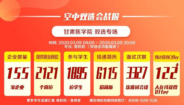 面对新冠肺炎疫情给就业工作带来的挑战,招生就业处根据省教育厅工作部署,积极制定就业工作方案,多方联系用人单位和第三方就业平台,精心筹备线上双选会,努力实现线上招聘不停歇、就业服务不断线。3月9日,我院2020届毕业生线上双选会(第一场)成功在 “易校招”APP平台举办。本次“双选会”共有来自全国24个省、市的155家用人单位报名参会,提供就业岗位2121个。我院共有1611名毕业生参与此次双选会,投递简历6115份,...
