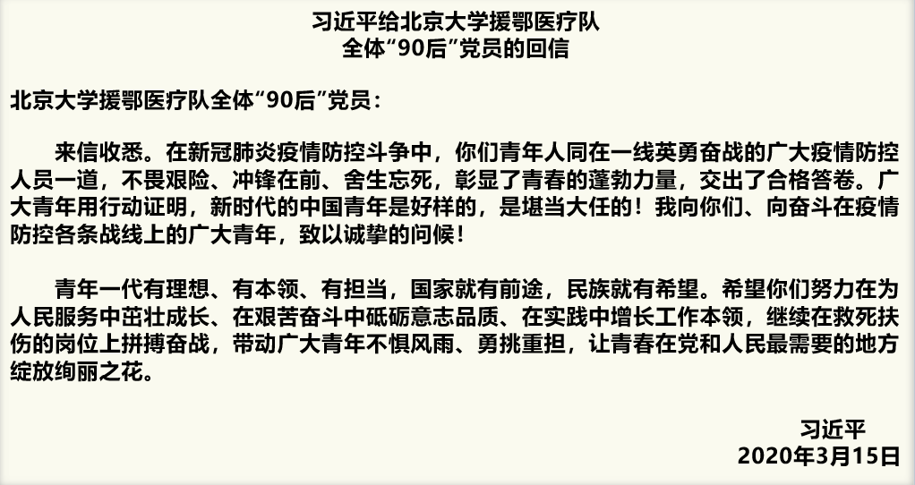 中共中央总书记、国家主席、中央军委主席习近平3月15日给北京大学援鄂医疗队全体“90后”党员回信,向他们和奋斗在疫情防控各条战线上的广大青年致以诚挚的问候。 习近平在回信中表示,在新冠肺炎疫情防控斗争中,你们青年人同在一线英勇奋战的广大疫情防控人员一道,不畏艰险、冲锋在前、舍生忘死,彰显了青春的蓬勃力量,交出了合格答卷。广大青年用行动证明,新时代的中国青年是好样的,是堪当大任的! 习近平指出...