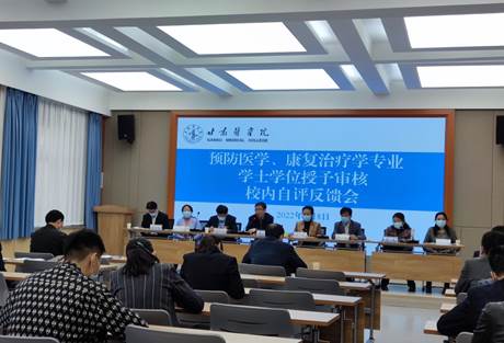 学院预防医学、康复治疗学专业学士学位授予审核校内自评工作顺利进行4月8日下午,学院召开预防医学、康复治疗学专业学士学位授予审核工作校内自评反馈会,党委书记高淑美,院长王坤及专家组全体成员出席会议。反馈会上,专家组成员一致认为,学院预防医学专业达到了学士学位授权的基本要求;康复治疗学专业本科毕业生教育质量达到了本科生毕业要求,教育质量良好,教学条件和教学水平满足授予学士学位的要求。本着对医学教育发...