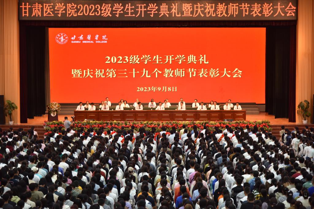 丹桂飘香秋意浓,金风送爽硕果丰。9月8日,甘肃医学院在体育馆隆重召开2023级新生开学典礼暨教师节表彰大会,热烈欢迎来自全国20个省(市、区)2564名朝气蓬勃的青年学子,和甘医全体教师共同庆祝第39个教师节。党委书记汪永锋主持会议并讲话,院长王坤出席会议并讲话,纪委书记杨建福出席会议并宣读先进集体表彰决定,副院长、附属医院党委书记雷鹏举出席会议并宣读优秀教师、优秀教育工作者、优秀辅导员表彰决定。下午4时,...