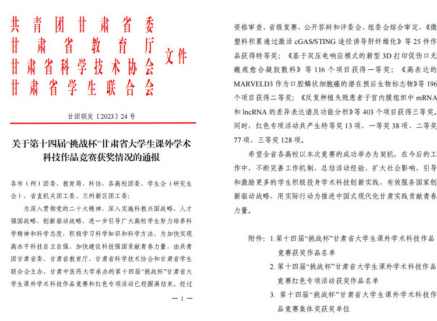 近日,团省委、省教育厅、省科协、省学联下发《关于公布第十四届“挑战杯”甘肃省大学生课外学术科技作品竞赛名单的通知》(甘团联发〔2023〕24号),我院共有18件作品在竞赛中获奖,其中主体赛事科技发明制作类10件作品、自然科学类3件作品、哲学社会科学类5件作品。主体赛事作品荣获省级一等奖1项,二等奖8项,三等奖9项。学校团体竞赛成绩荣获“优秀组织奖”,充分展现了甘医学子的专业素养和科研探索精神。 一等奖二等奖三...