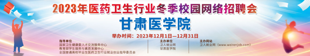 尊敬的用人单位:为贯彻落实党中央、国务院“稳就业”决策部署,促进2024届医药卫生类毕业生更高质量就业,我校联合国家卫生健康委人才交流服务中心下属“卫人就业网”,定于2023年12月1日-31日在线举办“2023年医药卫生行业冬季校园网络招聘会(甘肃医学院专场)”,为用人单位和毕业生搭建线上交流平台。现将有关事项安排如下: