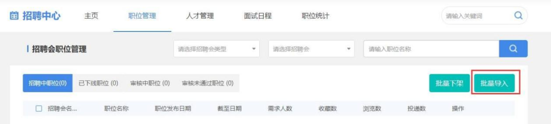 2.如需发布职位较多,网站支持职位批量导入。请下载“职位导入模板”,准确填写职位信息后上传填写好的文件(请严格按照批量导入模板要求填写,勿修改模板格式,模板格式修改可能导致上传失败)。