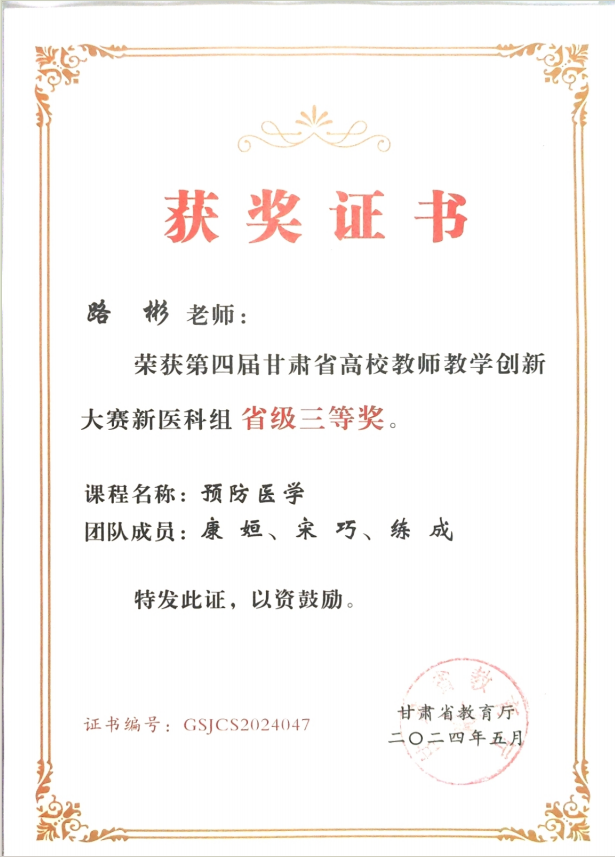 近日,由甘肃省教育厅主办,甘肃中医药大学承办的第四届甘肃省高校教师教学创新大赛落下帷幕,此次大赛以“推动教学创新 培养一流人才”为主题,我校预防医学系教师团队通过校赛初审、省级网络评审和现场评审斩获新医科组三等奖。