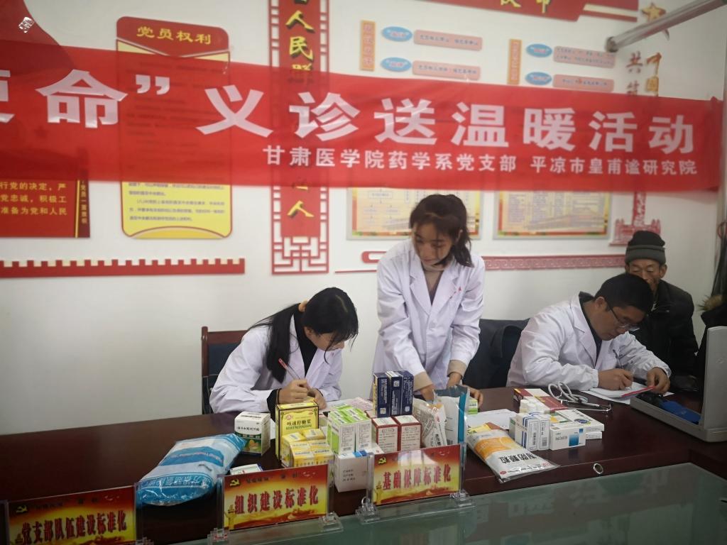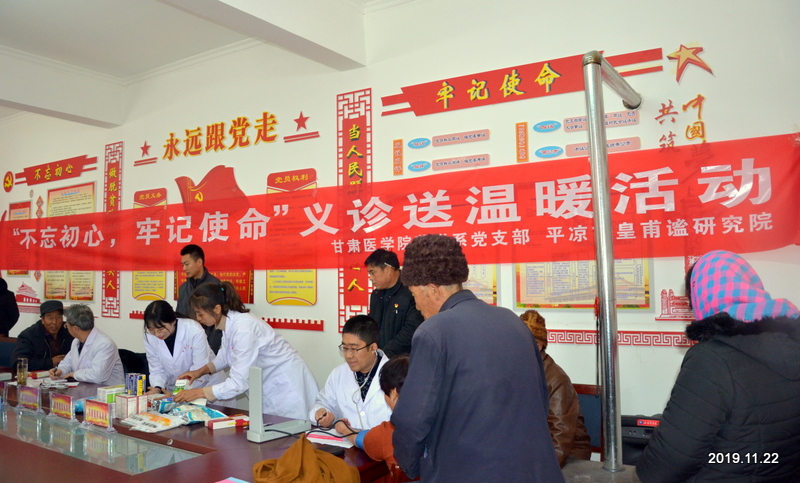 为积极开展“不忘初心、牢记使命”主题教育,切实关注民生,体现甘肃医学院高校服务社会的职能。甘肃医学院药学系党支部、平凉皇甫谧研究院于2019年11月22日赴庄浪县卧龙镇庙湾村开展“不忘初心、牢记使命“义诊送温暖主题党日活动。本次义诊送温暖活动由药学系党支部书记、皇甫谧研究院院长赵中玮同志带队,参与师生8人。义诊过程中,专家耐心解答村民对常见病、慢性病的咨询及初步诊断,并提出具体的治疗建议和注意事项。药缘协会志愿者同学为患者发放药品及药品服用方法、中药煎服方法宣传册,切实把真情关爱送到群众中。此次义诊村民80余人次,免费发放药品价值两千余元、宣传册百余份,受到广大村民的一致好评。