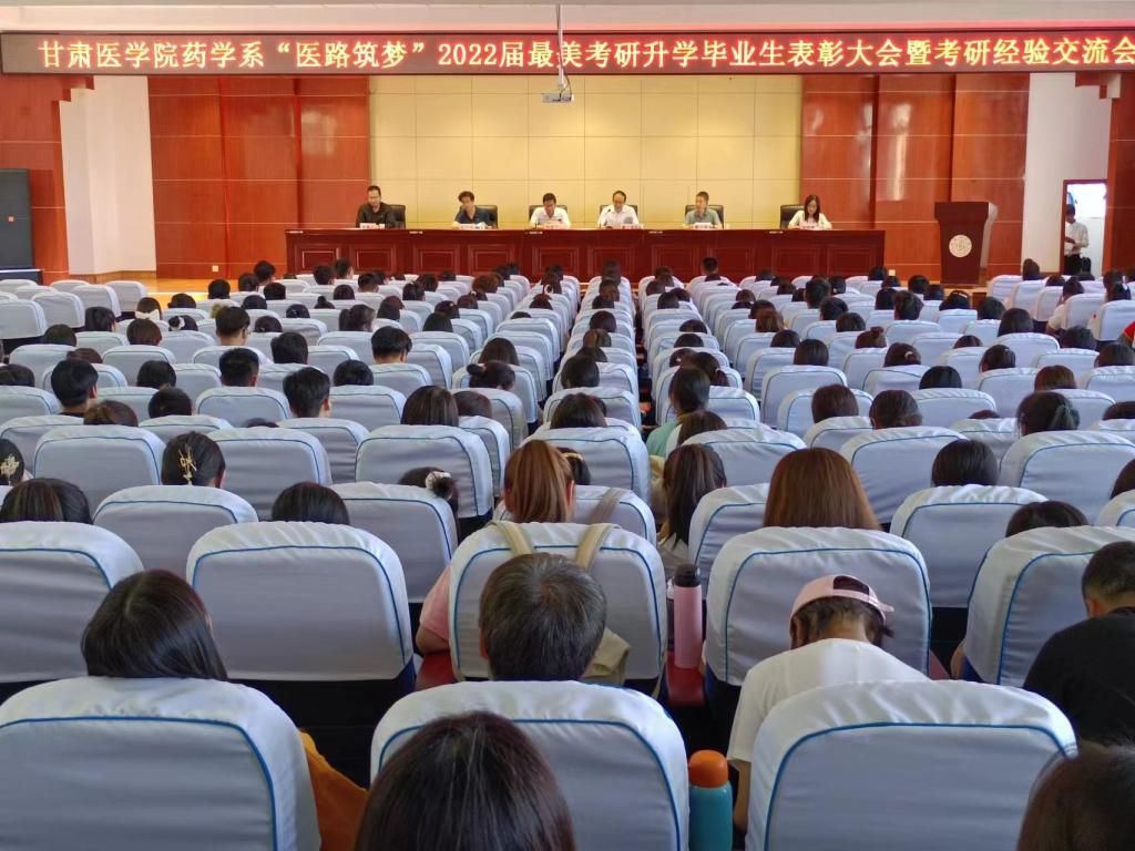 为表彰先进,树立典型,进一步培育良好学风,根据学院领导批示,受学院学生工作部和招生就业处两个部门的大力支持,我系于6月24日晚在科技楼五楼学术报告厅隆重召开甘肃医学院药学系“医路筑梦”2022届最美考研升学毕业生表彰大会暨考研经验交流会。出席大会的有甘肃医学院学生工作部部长柳爱平,甘肃医学院招生就业处处长戴三军,药学系党总支书记、系主任赵中玮,药学系副主任戴兴德、药学系教务科副科长武喜红、药学系团总支书记李晓青以及药学系2022届毕业班全体班主任、辅导员,药学系2022年考取硕士研究生的全体同学和在校学生代表共计300余人。