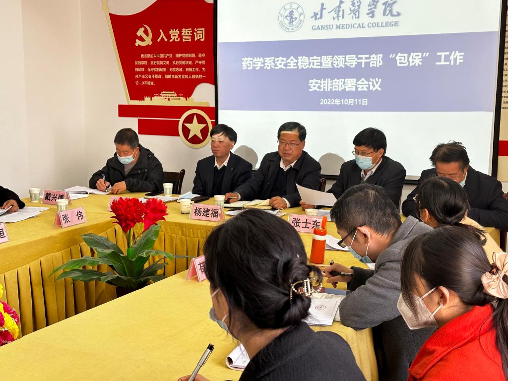 为全面贯彻落实学院关于做好党的二十大维稳安保工作相关要求,进一步压实各级责任、守牢安全底线,为党的二十大胜利召开创造安全稳定的校园政治环境,药学系于2022年10月11日下午召开了安全稳定暨领导干部“包保”工作安排部署会议。会议由药学系党总支书记、系主任赵中玮主持,“包保”药学系的学院党委委员、纪委书记杨建福出席会议并讲话,“包保”药学系各班级的学院相关部门领导干部及药学系全体教职员工参加会议。