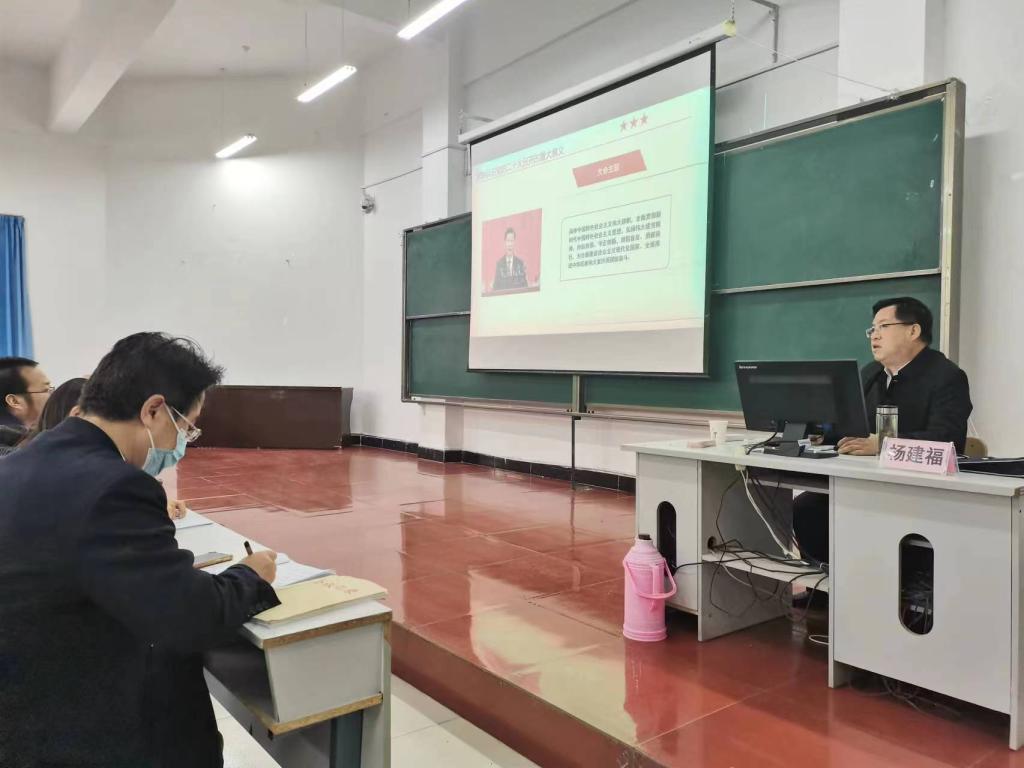 杨建福以“学思践悟党的二十大精神,努力构建大思政育人新格局”为主题,围绕“深刻认识党的二十大召开的重要意义,加深理解党的二十大主题,认真学习党的二十大报告的主要内容”等三个方面,对党的二十大报告进行了深刻分析和详细解读。他谈到,习近平总书记的党的二十大报告高瞻远瞩、博大精深,关于全面建设社会主义现代化国家的总体战略部署,是以中国式现代化全面推进中华民族伟大复兴根本遵循。面对百年未有之大变局,新时代新征程中国共产党的中心任务就是团结带领全国各族人民全面建成社会主义现代化强国,实现第二个百年奋斗目标,体现了以习近平同志为核心的党中央推进中华民族伟大复兴的雄心壮志!