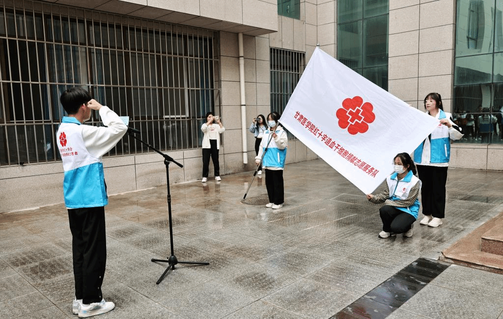 杨芳胜、王坤为平凉市红十字应急救护培训基地揭牌,郭宏为甘肃医学院红十字造血干细胞捐献志愿服务队授旗,甘肃医学院红十字造血干细胞捐献志愿服务队志愿者进行了庄严宣誓。