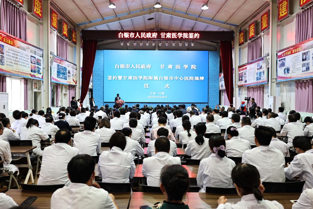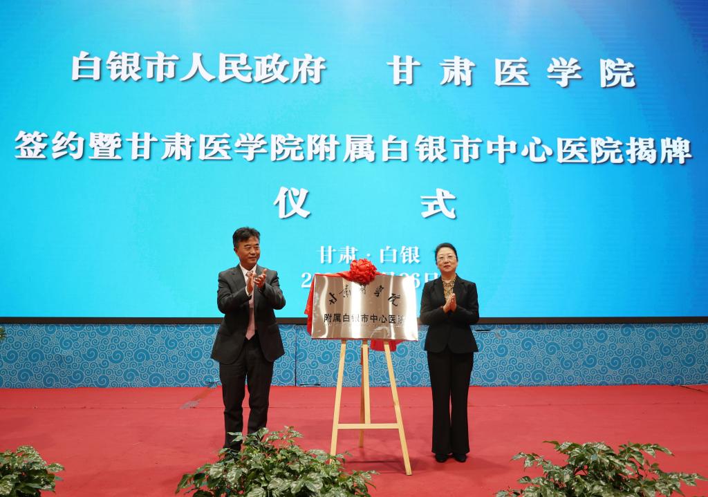 金秋九月,硕果累累。在这个充满喜悦与丰收的时刻,9月26日,白银市人民政府与甘肃医学院签约暨甘肃医学院附属白银市中心医院揭牌仪式在白银市平川区举行。白银市人民政府副市长李敏娜,甘肃医学院党委书记、教授汪永锋,省教育厅高教处副处长王怡,甘肃医学院院长、教授王坤,白银市卫生健康委员会党委书记、主任达春和,平川区区委副书记、区长来进明,靖煤集团公司党委书记、董事长陈虎,甘肃医学院副院长、附属医院党委书记、教授雷鹏举出席见证,学校办公室、党委组织部(人事处)、学生工作部(处)、教务处、实践教学管理处等部门负责人以及白银市平川区卫生健康局负责人、白银市医疗卫生战线各单位负责人,附属白银市中心医院领导班子、各科室负责人以及学校实习学生代表参加,白银市平川区政府副区长寇志宏主持。