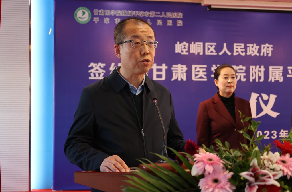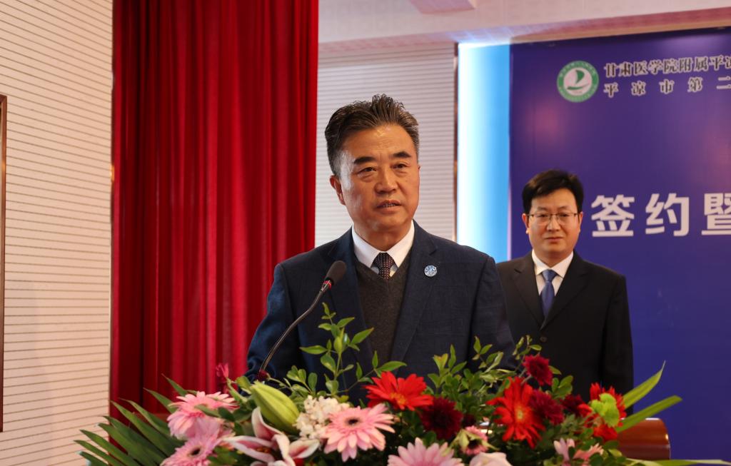 罗彦鹏在致辞中表示,此次院校联手,将有力促进双方医疗教学与临床实践紧密结合,实现优势互补、共同发展。特别是对平凉市第二人民医院来说,成为甘肃医学院附属医院后,将可依托甘肃医学院强大的人才、科研等优势,全面促进专业人员培养、学科建设和医疗服务能力提升,实现医院医教研工作全面协调发展。希望平凉市第二人民医院以这次签约揭牌为契机,按照合作共建协议,全面提升医院综合实力和核心竞争力,努力把医院建成集医疗、教学、预防、保健、康养于一体的综合性医疗集团,以更优质的服务、更精湛的技术、更优良的信誉回报社会、回馈群众,切实为全区卫生健康事业发展和人民身体健康、生命安全保驾护航。