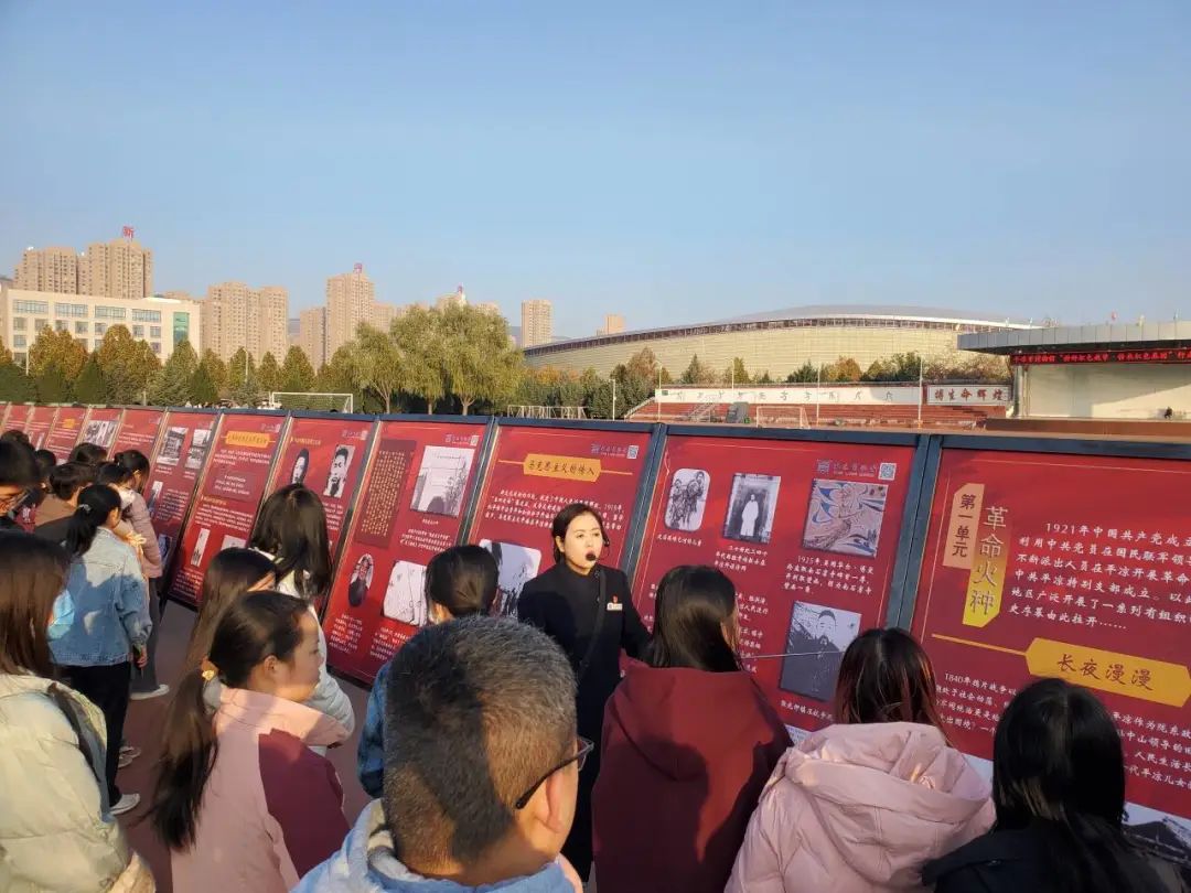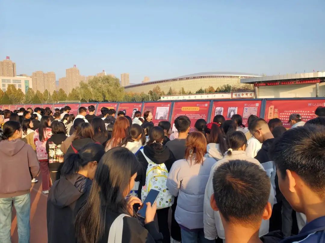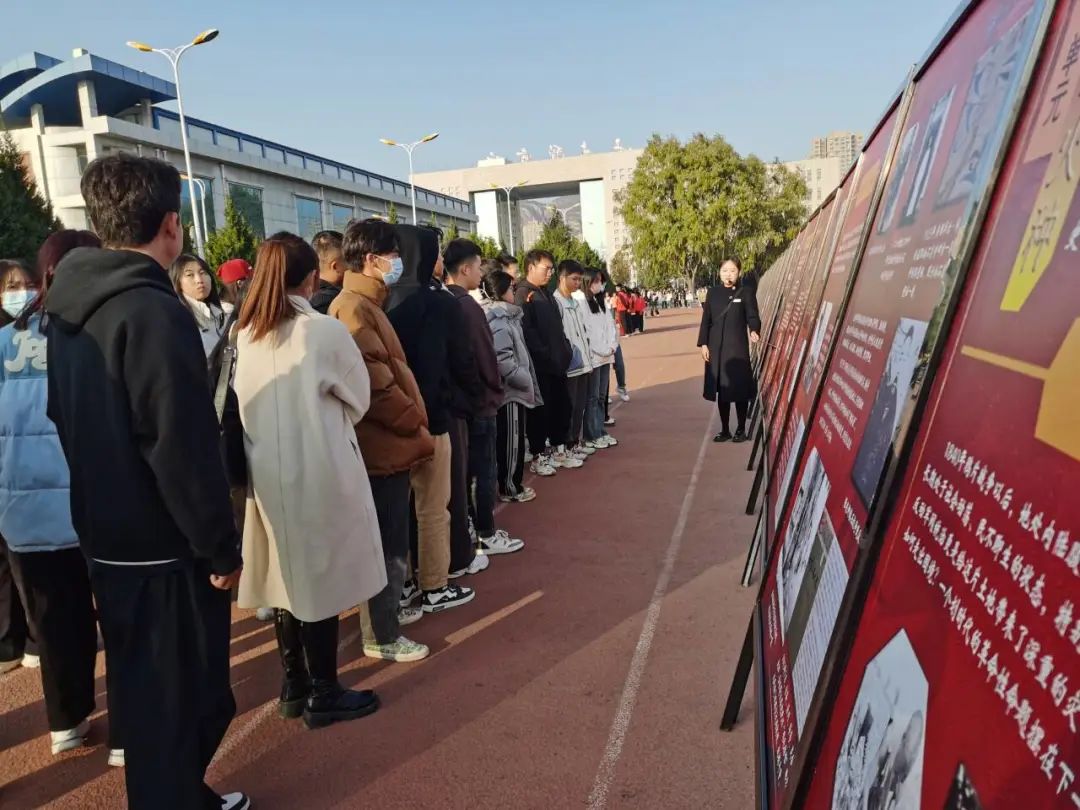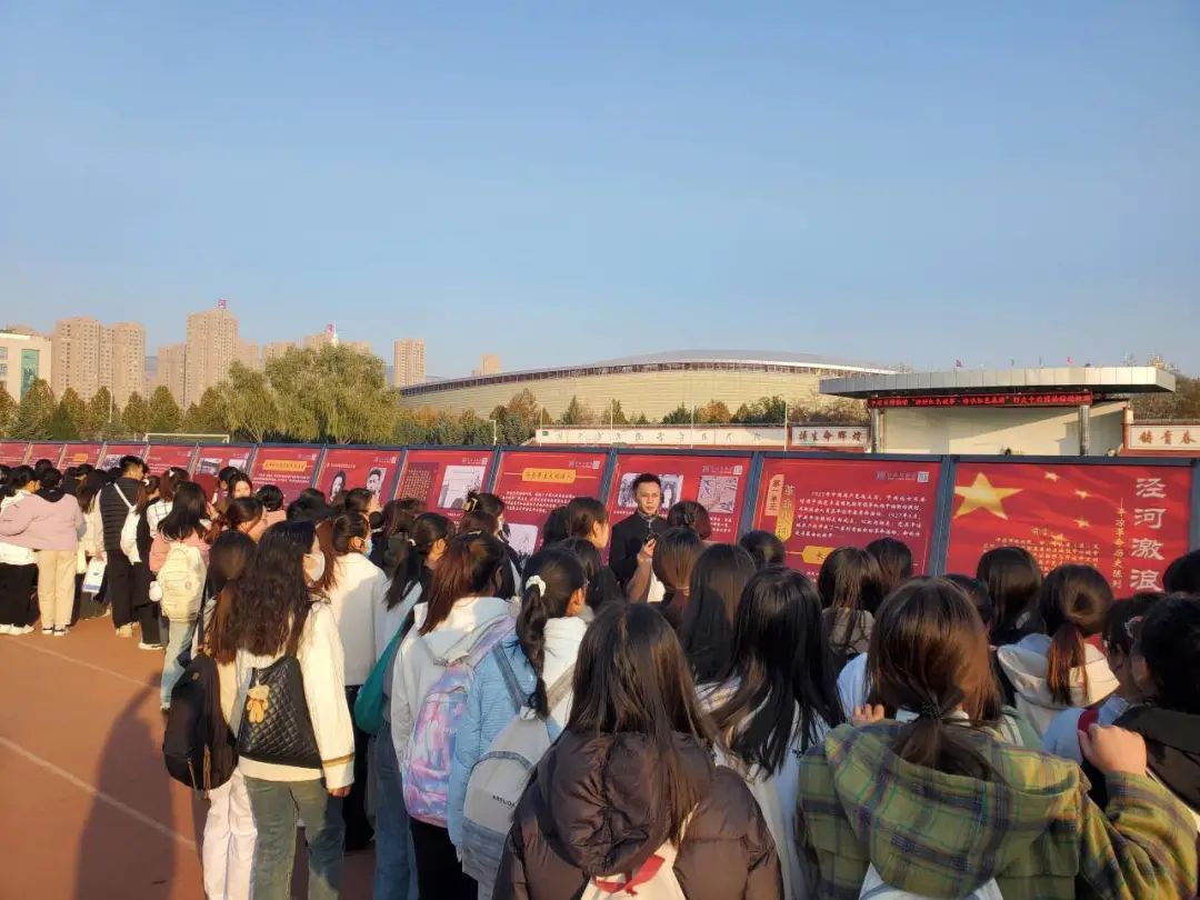 冬日暖阳下,学校操场上洋溢着火热的青春气息。40面《泾河激浪——平凉革命历史图片展》及党的二十大精神主题图片展一字排开,犹如铺展开来的历史长卷。两千余名学生有序排队参观,认真聆听有关平凉的革命故事,一面面图板集中展示了这片红土地上的峥嵘岁月,一幕幕辉煌诗篇涤荡激励着年轻学子们的身心世界。