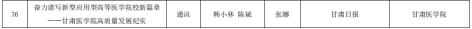 学校获得二等奖的作品《男子火车上突发腹痛甘医学子针灸施治获良效》(作者:陈斌,编辑:闫婷)2022年5月15日首发于学校官方网站;《奋力谱写新型应用型高等医学院校新篇章——甘肃医学院高质量发展纪实》(作者:韩小林、陈斌,编辑:张娜)于2022年10月14日在《甘肃日报》首发。