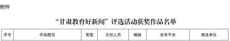 近日,“甘肃教育好新闻”评选结果揭晓,我校报送的作品中有2篇入选,分别荣获二等奖。
