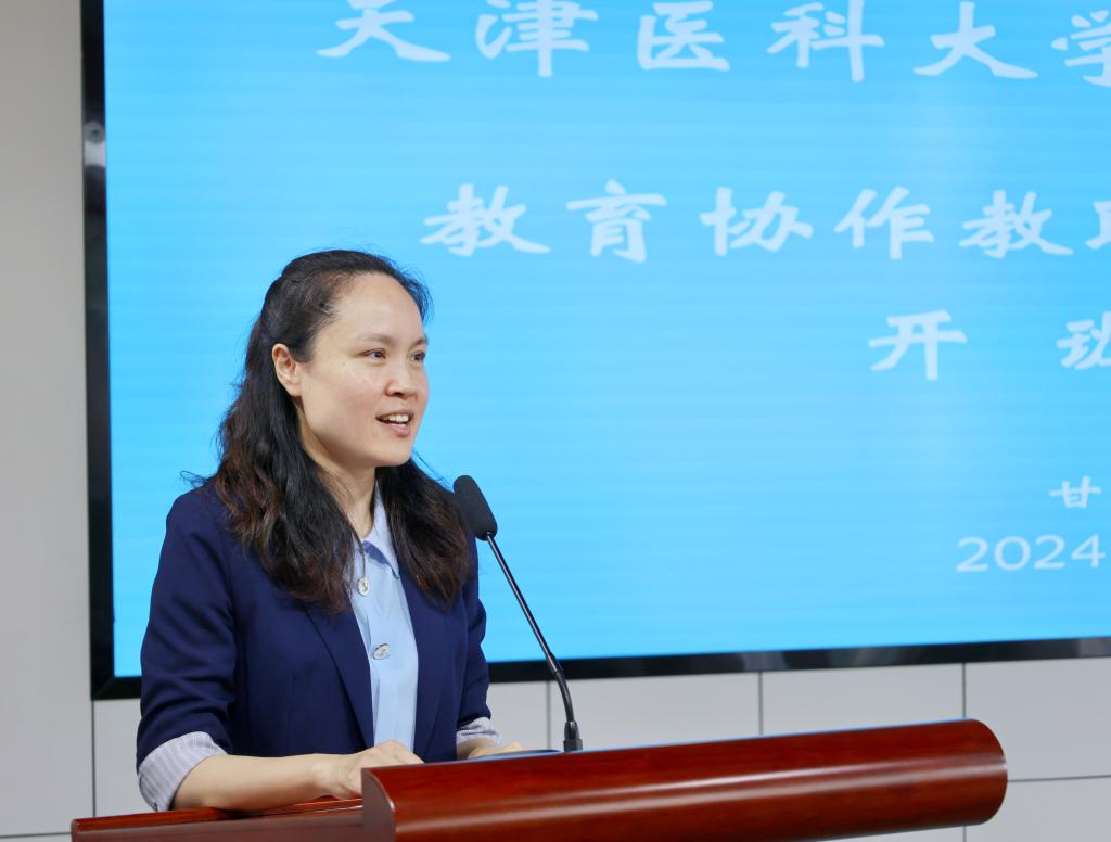 舒珺在致辞中简要介绍了天津医科大学办学历程后指出,教育是推动社会进步的基础,医学教育是关乎人民健康福祉的关键,两校都属于地方独立办学的医学院校,在办学上有相似之处,也各有特点,希望进一步加强交流,开展深度合作共建,共同致力于培养更多优秀的医学人才,推动资源共享。期待通过交流合作,使两校的老师学生得以相互启发、互补进步,促进两校文化融合与创新,共同推进甘肃地区医学教育和学科发展。希望不断深化两校友谊,创新交流组织机制,严格推进两校教育协作发展,确保合作的持续性和有效性,努力培养更多优秀医学人才。