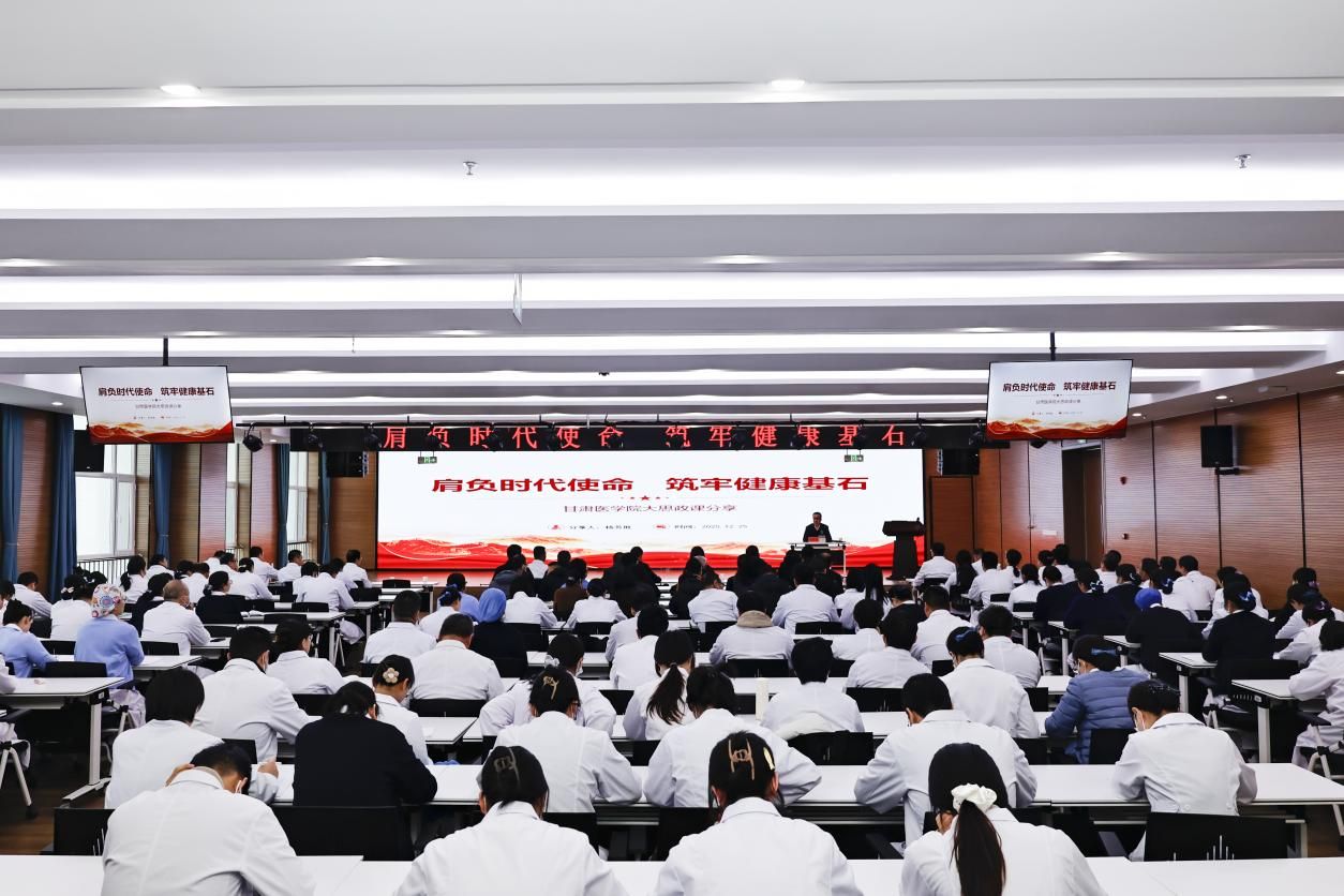 为深入贯彻落实省委关于厅局级主要领导干部讲思政课的部署要求,扎实推进党的创新理论进校园、进课堂、进头脑,12月25日,我校特邀甘肃省医疗保障局党组书记、局长杨芳胜来校作题为《肩负时代使命 筑牢健康基石》的专题报告。党委书记汪永锋主持报告会并讲话,学校领导班子成员、全体处科级干部、附属医院职工和学生代表近200人现场聆听报告。