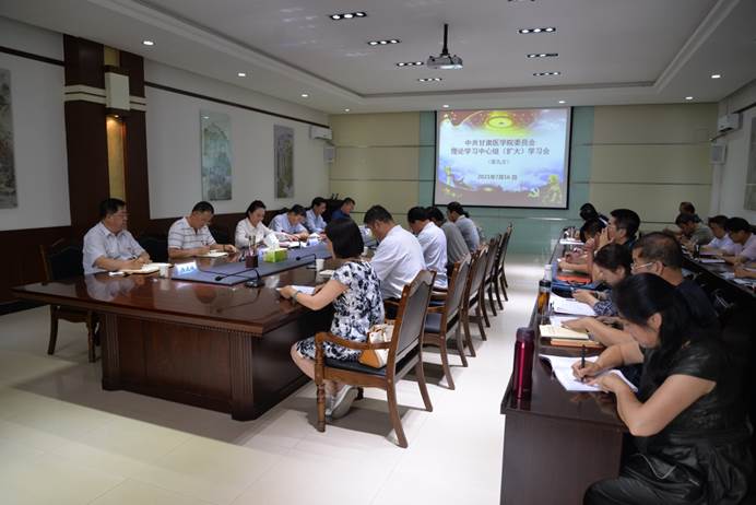 7月16日下午,学院党委书记高淑美主持召开党委理论学习中心组(扩大)学习会议,继续深入学习习近平总书记在庆祝中国共产党成立100周年大会上的重要讲话精神,传达甘肃省庆祝中国共产党成立100周年座谈会议精神,学习中央教育工作领导小组印发《关于深入学习贯彻党的教育方针的通知》精神。院长王坤列席会议,党委副书记、副院长崔安平,副院长李诚,纪委书记杨建福,副院长、附属医院党委书记雷鹏举出席会议。