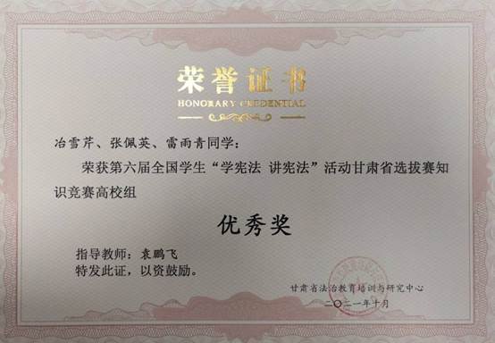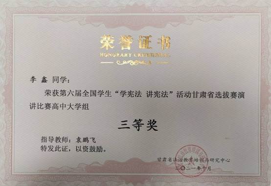 本次活动由学生工作部(处)组织实施,护理系辅导员袁鹏飞老师带队于1018-21日赴甘肃政法大学参加活动。通过各参赛队员的认真准备、积极备赛、精彩演讲和激烈答题,最终李鑫同学演讲的《共抗疫情,守宪于心》获得三等奖,冶雪芹、张佩英、雷雨青三名同学获知识竞赛优秀奖。