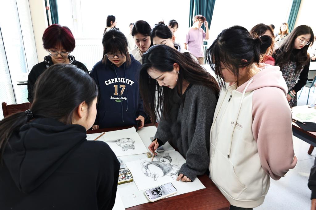 陇东学院的专业老师们围绕作品的布局、色彩、线条等方面进行了详细指导,帮助同学们更好地掌握绘画技巧,提升艺术修养。刘宏伟、孔德民老师现场挥毫泼墨,同学们认真观看并学习他们的绘画技巧。