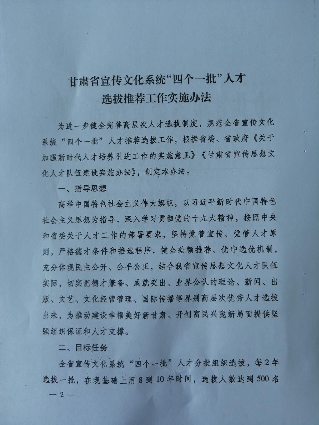 中共甘肃省委宣传部关于印发《甘肃省宣传文化系统“四个一批”人才选拔推荐工作实施办法》的通知
