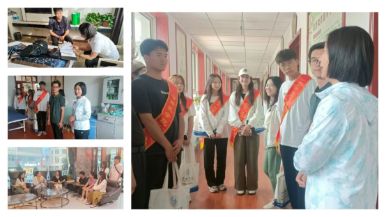 图为志愿服务队向老师汇报活动进展并与指导老师一起参观中医馆